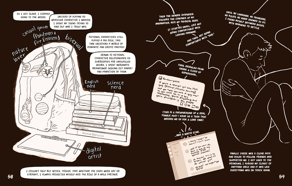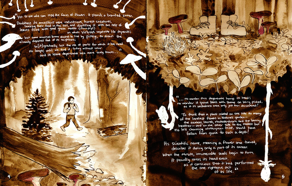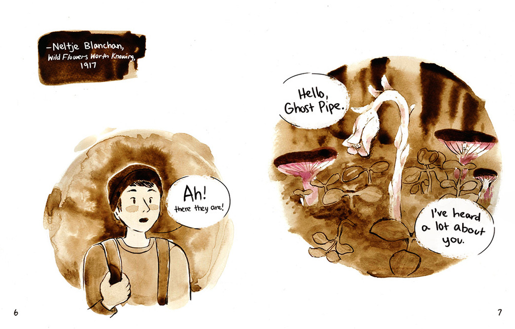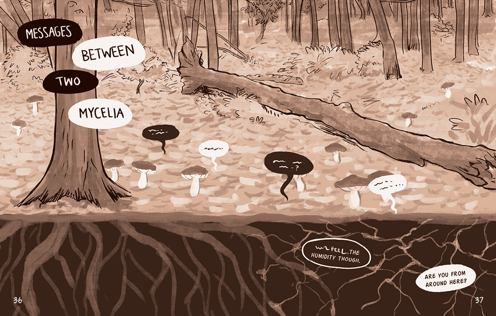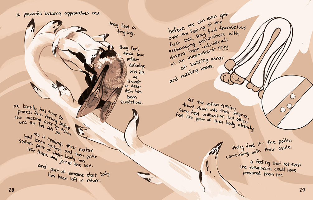 A multi-POV experimental graphic memoir that explores my understanding of gender while intertwining human, plant, and fungus experiences. What can non-humans teach me about transness? Find out in these many fully illustrated pages, some made with hand-foraged inks on watercolor paper and others digitally rendered.